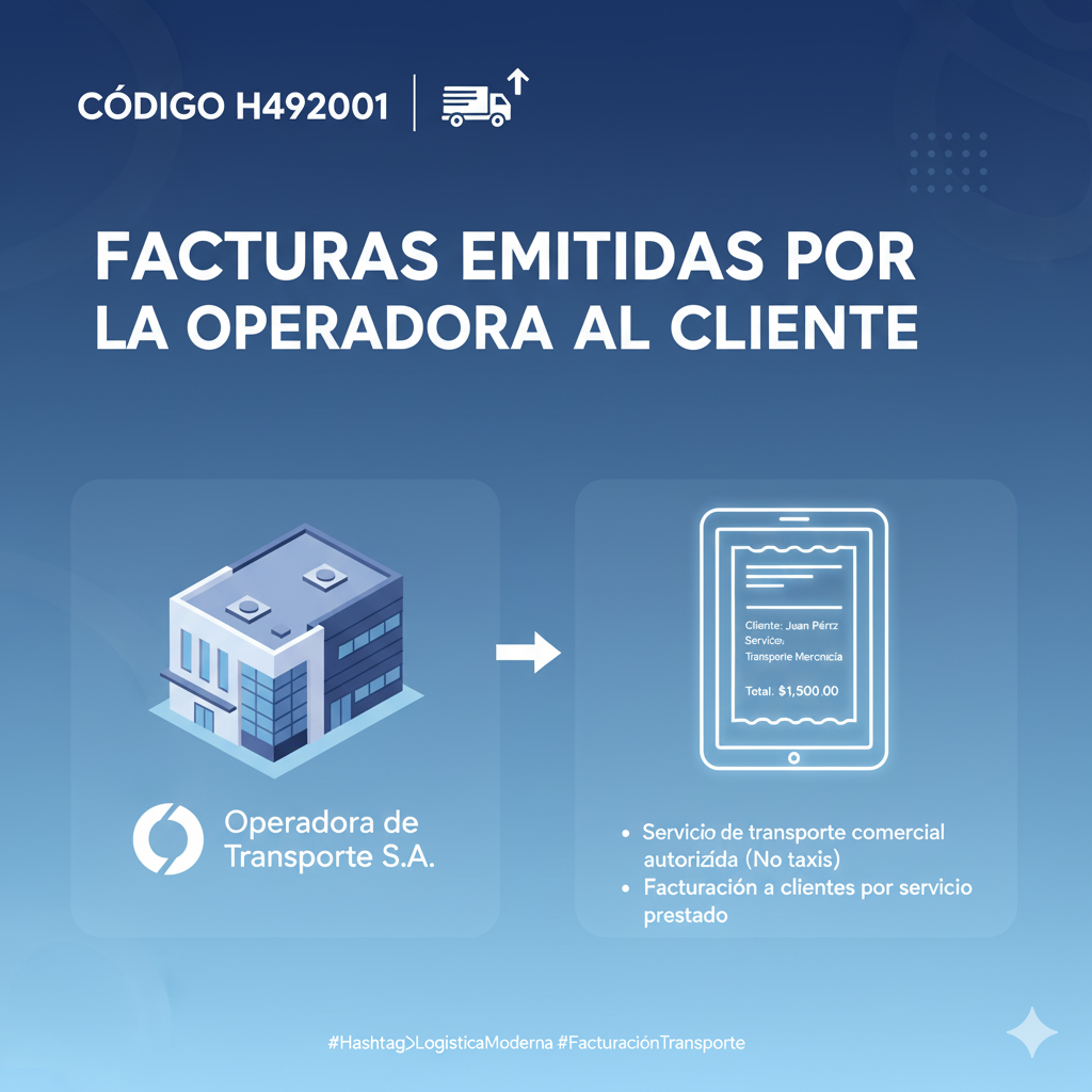 H492001 | Facturas emitidas por la operadora al cliente | Aplica para facturas emitidas por la operadora de transporte comercial (excepto taxis) a sus clientes por la prestación del servicio. |